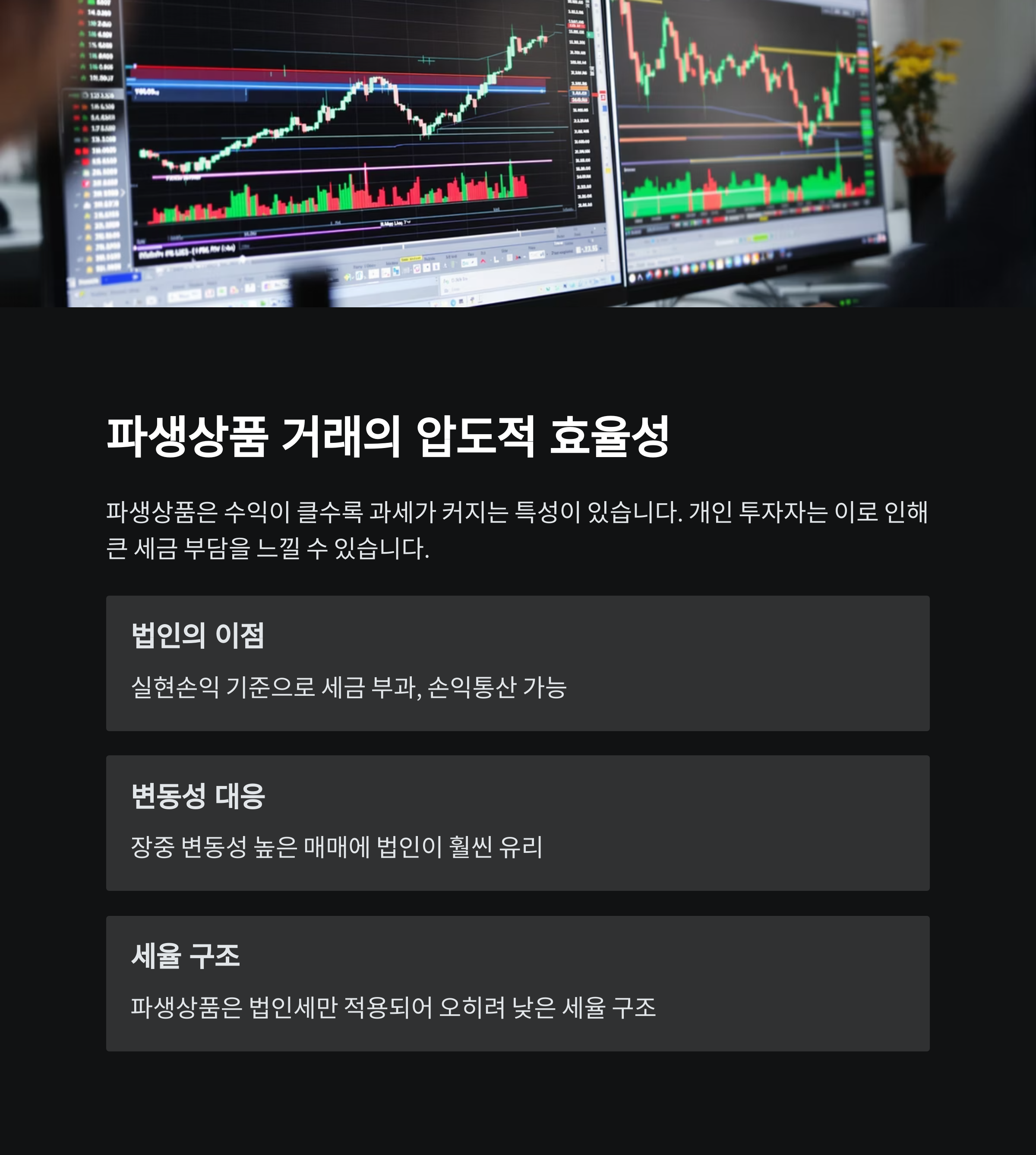 - 파생상품은 법인세만 적용되어 오히려 낮은 세율 구조