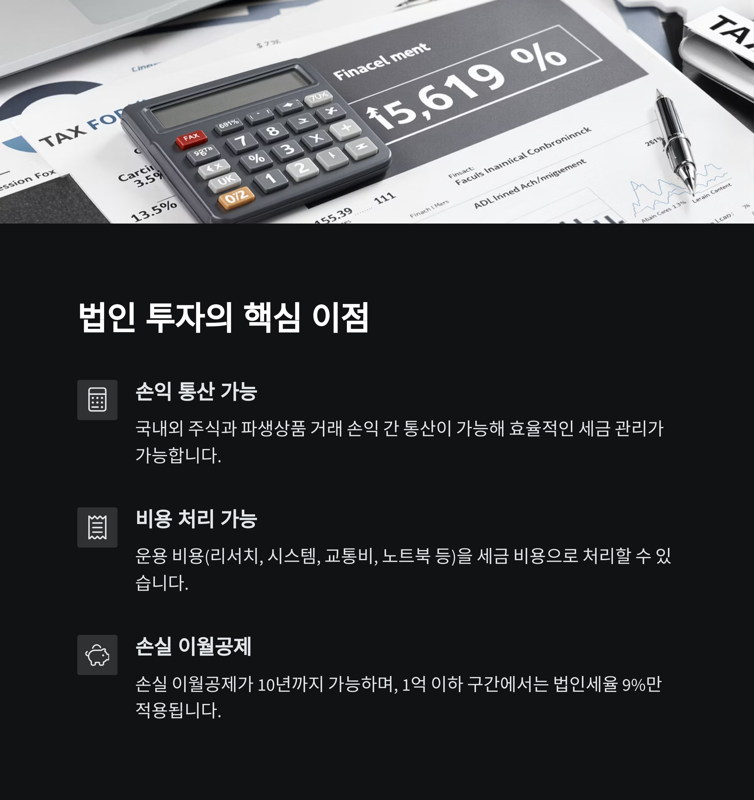 **1인 법인을 통한 투자 구조는 분명한 절세 및 자산 운용 이점을 가집니다.**