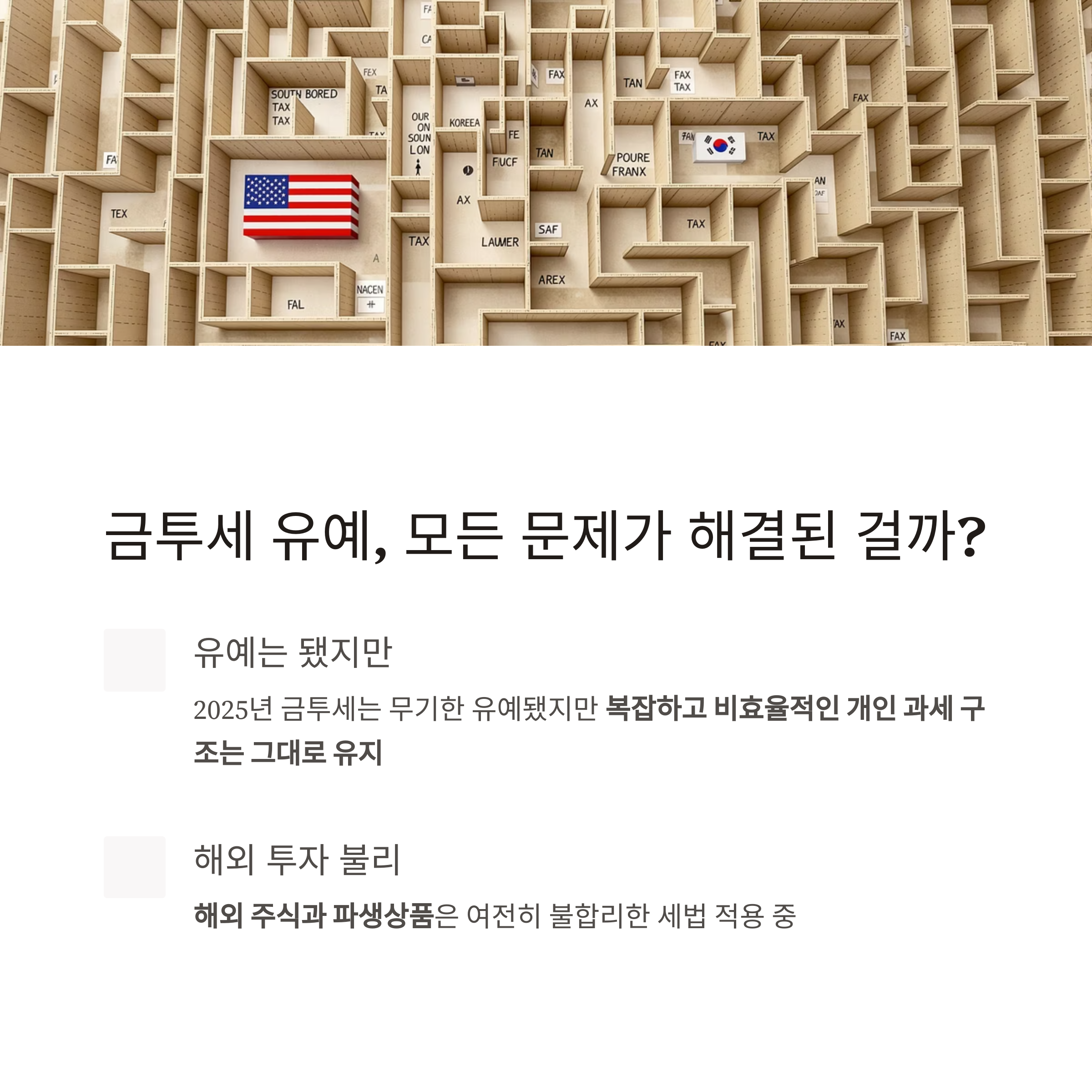- 특히 **해외 주식과 파생상품**은 여전히 불합리한 세법 적용 중