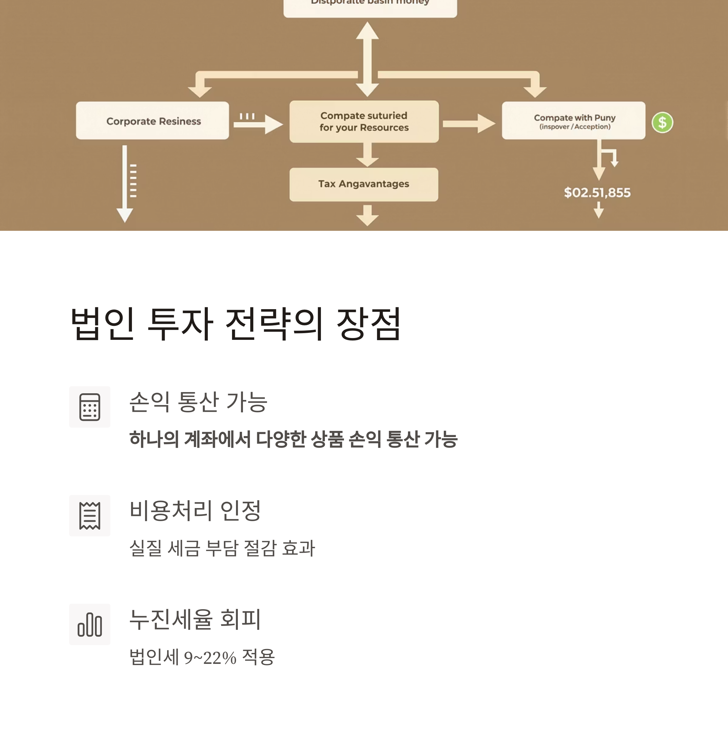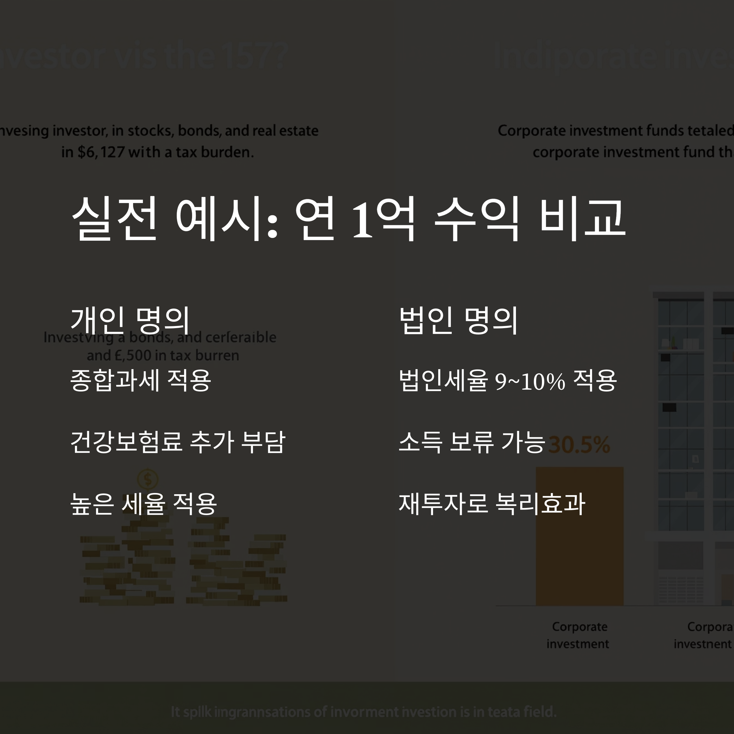 - 법인 명의로 운용 시 법인세율 9~10% + 소득 보류 + 재투자 가능