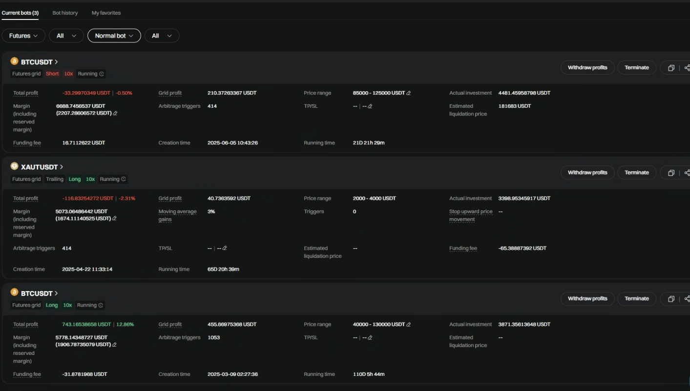 AI 그리드를 중단하면 모든 미체결 주문이 자동으로 취소되며, 보유 중인 자산은 계정 잔고로 반환됩니다. 멈추기 전 현재의 수익 상태를 확인하고 종료 여부를 결정하는 것을 권장합니다.