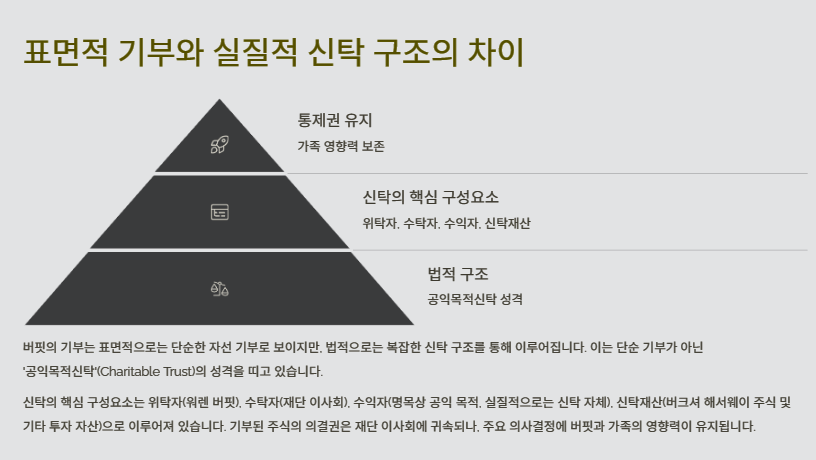 버핏의 기부는 표면적으로는 단순한 자선 기부로 보이지만, 법적으로는 복잡한 신탁 구조를 통해 이루어집니다. 이는 단순 기부가 아닌 '공익목적신탁'(Charitable Trust)의 성격을 띠고 있습니다.
